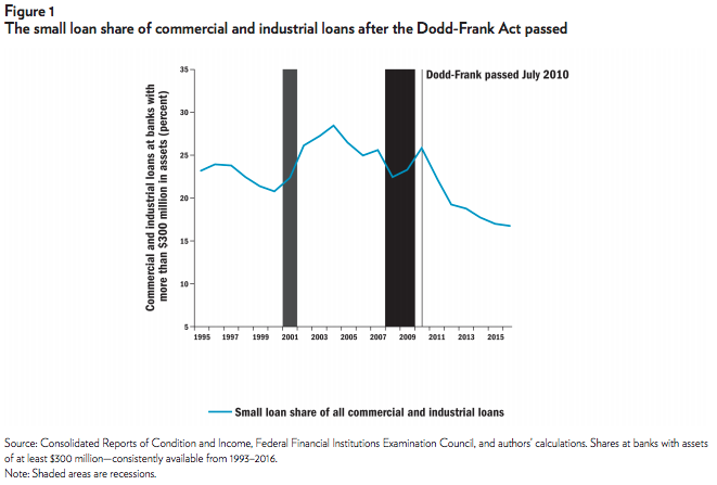 One such concern is that the DFA has unduly impeded small-business lending, and thereby may have impeded the pace of business formation, which has been unusually slow in recent years. By increasing the fixed regulatory compliance requirements for making business loans and operating a bank, the DFA has disproportionately reduced the incentives of all banks to make very small loans and reduced the viability of lesser-sized banks, whose small-business share of commercial and industrial (C&I) loans is generally much higher than that of larger banks. Commercial and industrial loans to small firms relative to others may also decline to the extent that stress tests tend to apply higher risk assessments on loans to small or new firms. It has been argued that through these intensive and extensive margin effects the DFA has impeded small-business lending during the recovery from the Great Recession.