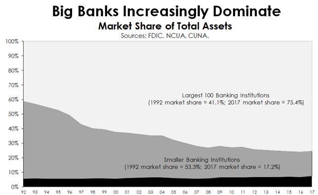 The first is a marked reduction in the number of banks, which dropped to 4,918 in 2017 from 7,077 in 2008, and as many as 10,453 when the Riegle Neal Act (which liberalized branching) was passed in 1994. Credit unions, as you know, have witnessed a similar trend: As of June 2018, there were 5,594 chartered credit unions, compared to 12,333 in 1994.