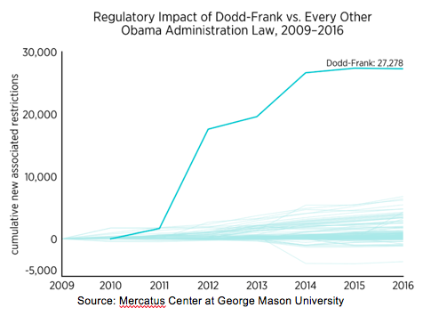But it’s likely that non-economic factors have also played a significant role, since the second structural trend is a steady growth in the scale and scope of financial regulation. Between 1970 and 2008, regulatory restrictions on credit intermediaries grew fourfold, from around 10,000 to 40,000 on the eve of the crash. The Dodd-Frank post-crisis regulatory package, on its own, piled another 27,000 regulations on the financial sector as a whole — in what has been called “one of the biggest regulatory events ever.”