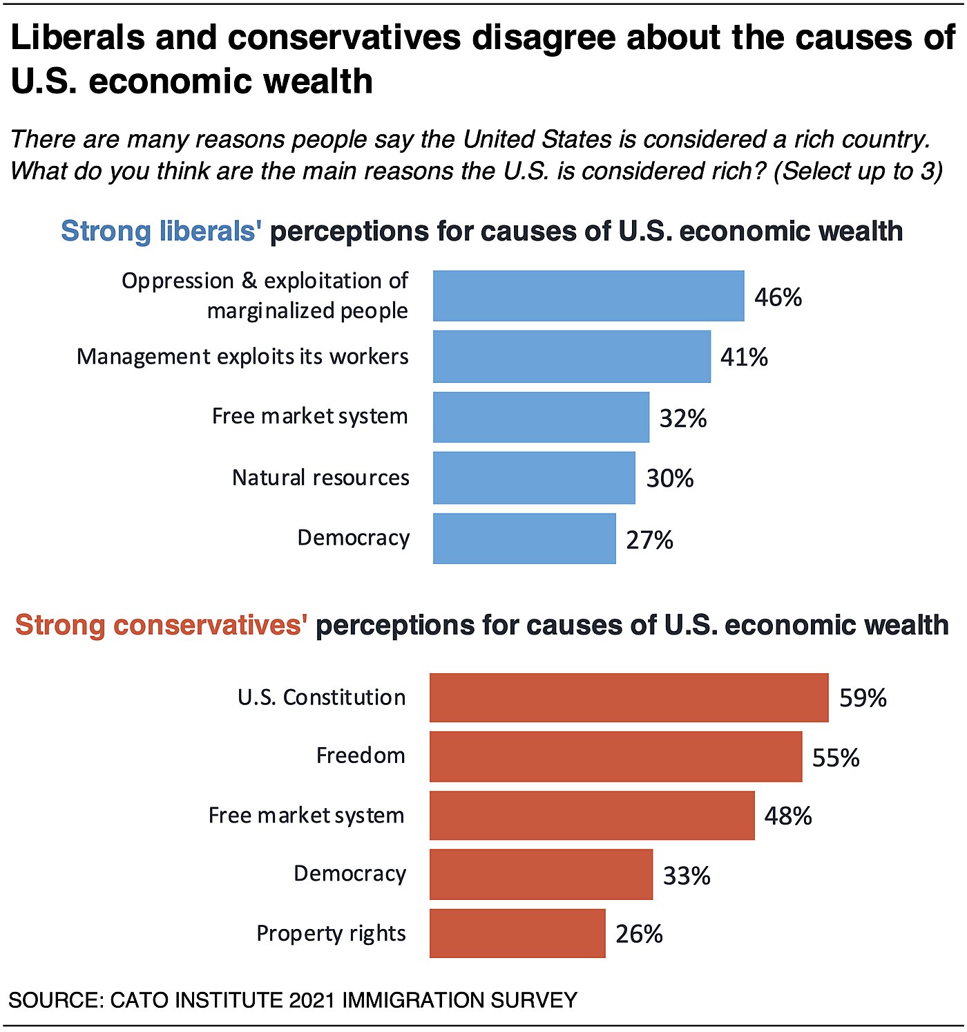 A plurality of strong liberals says that oppression and exploitation of marginalized people (46%) is the main reason, as well as management’s exploiting their workers (41%). After that about a third say the free market system (32%) and natural resources (30%) are primarily responsible and about a quarter (27%) say democracy. In contrast, majorities of strong conservatives say that the U.S. Constitution (59%) and freedom (55%) are the main causes of economic success. About half (48%) say the free market system, a third say democracy (33%), and a quarter say securing property rights (26%) are the primary causes of the nation’s wealth.