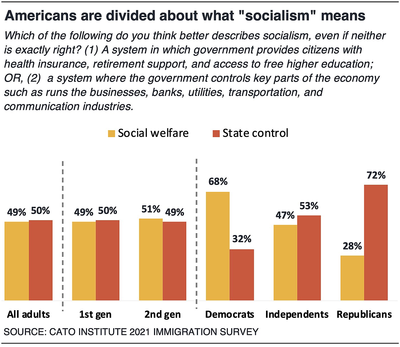 But do Americans agree what socialism means? Its definition is often the subject of dispute. Overall, Americans are divided in half about what socialism means, with 50% who think it means “a system where the government controls key parts of the economy such as runs the businesses, banks, utilities, transportation and communication industries,” and 49% who think it means “a system in which government provides citizens with health insurance, retirement support, and access to free higher education.” First- and second-generation immigrants also are evenly divided about whether socialism means state control or social welfare.