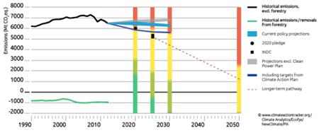 “According to our analysis, the finalised Clean Power Plan issued in August 2015 contributes to moving towards the emission levels indicated in the INDC. But the US will need to implement additional policies to reach its proposed targets. The planned policies (e.g. the additional actions mentioned in the Climate Action Plan), if fully implemented, are sufficient to meet the 2020 pledge. The US will have to implement additional policies on top of the currently planned policies to reach its 2025 pledge, which requires a faster reduction rate than the rate before 2020.”