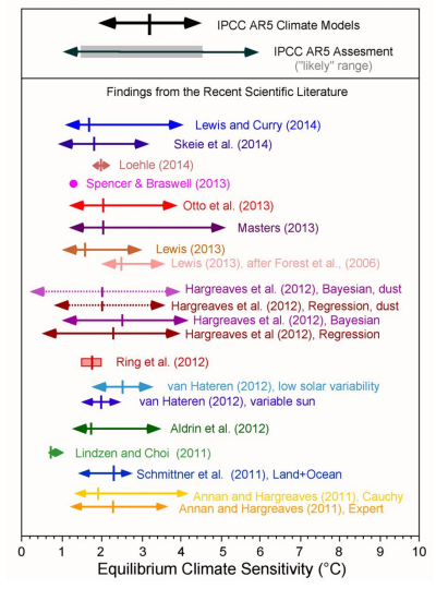 Figure 4. Climate sensitivity estimates from new research beginning in 2011 (colored), compared with the assessed range given in the Intergovernmental Panel on Climate Change (IPCC) Fifth Assessment Report (AR5) and the collection of climate models used in the IPCC AR5. The “likely” (greater than a 66% likelihood of occurrence) range in the IPCC Assessment is indicated by the gray bar. The arrows indicate the 5 to 95 percent confidence bounds for each estimate along with the best estimate (median of each probability density function; or the mean of multiple estimates; colored vertical line). Ring et al. (2012) present four estimates of the climate sensitivity and the red box encompasses those estimates. The right-hand side of the IPCC AR5 range is actually the 90% upper bound (the IPCC does not actually state the value for the upper 95 percent confidence bound of their estimate). Spencer and Braswell (2013) produce a single ECS value best-matched to ocean heat content observations and internal radiative forcing. The mean climate sensitivity (3.2°C) of the climate models used in the IPCC AR5 60% greater than the mean of recent estimates (2.0°C).