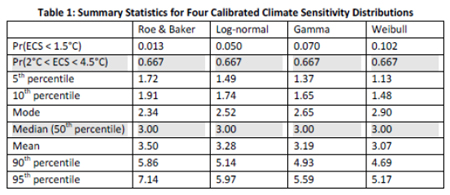 “Finally, we note the IPCC judgment that the equilibrium climate sensitivity “is very likely larger than 1.5°C.” Although the calibrated Roe & Baker distribution, for which the probability of equilibrium climate sensitivity being greater than 1.5°C is almost 99 percent, is not inconsistent with the IPCC definition of “very likely” as “greater than 90 percent probability,” it reflects a greater degree of certainty about very low values of ECS than was expressed by the IPCC.”