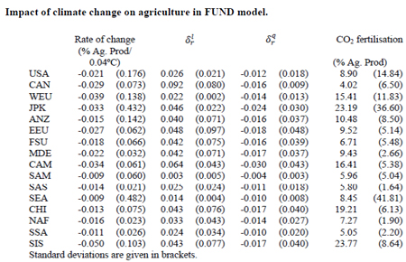 Column 8 in the table below shows the CO2 fertilization parameter (γr) used in FUND for various regions of the world (Anthoff and Tol, 2013b). The average CO2 fertilization effect across the 16 regions of the world is 11.2%. While this number is neither areally weighted, nor weighted by the specific crops grown, it is clear that 11.2% is much lower than the average fertilization effect compiled by Idso (2013) for the world's top 10 food crops (35%). Further, Idso's fertilization impact is in response to a 300ppm CO2 increase, while the fertilization parameter in the FUND model is multiplied by ln(CO2t/275) which works out to 0.74 for a 300ppm CO2 increase. This multiplier further reduces the 16 region average to 8.4% for the CO2 fertilization effect—some 4 times smaller than the magnitude of the fertilization impact identified by Idso (2013).