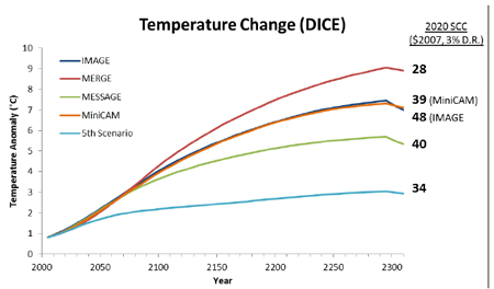 The figure below shows the projections of the future change in the earth's average surface temperature for the years 2000-2300 produced by DICE from the five emissions scenarios employed by the IWG. The numerical values on the right-hand side of the illustration are the values for the social cost of carbon associated with the temperature change resulting from each emissions scenario (the SCC is reported for the year 2020 using constant $2007 and assuming a 3% discount rate—numbers taken directly from Table A3 of the IWG2013 report). The temperature change can be considered a good proxy for the magnitude of the overall climate change impacts.