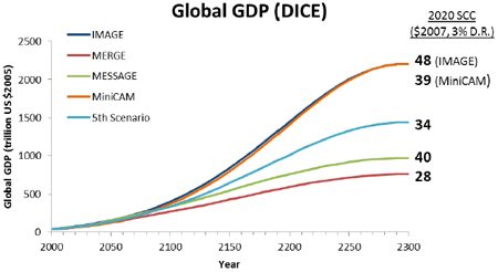 CAPTION: Future global gross domestic product, for the years 2000-2300 for each of the five emissions scenarios used by the IWG2013. The 2020 value of the SCC (in $2007) produced by the DICE model (assuming a 3% discount rate) is included on the right-hand side of the figure.