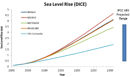 CAPTION: Projections of sea level rise from the DICE model (the arithmetic average of the 10,000 Monte Carlo runs from each scenario ) for the five scenarios examined by the IWG2013 compared with the range of sea level rise projections for the year 2300 given in the IPCC AR5 (see AR5 Table 13.8). (DICE data provided by Kevin Dayaratna and David Kreutzer of the Heritage Foundation).