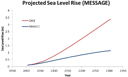 Using the MESSAGE scenario as an example, the sea level rise estimate produced by MAGICC for the year 2300 is 1.28 meters—a value that is less than 40% of the average value of 3.32 meters produced by the DICE model when running the same scenario (see figure below).