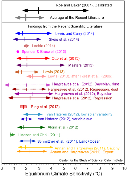 CAPTION: The median (indicated by the small vertical line) and 90% confidence range (indicated by the horizontal line with arrowheads) of the climate sensitivity estimate used by the Interagency Working Group on the Social Cost of Carbon Climate (Roe and Baker, 2007) is indicated by the top black arrowed line. The average of the similar values from 20 different determinations reported in the recent scientific literature is given by the grey arrowed line (second line from the top). The sensitivity estimates from the 20 individual determinations of the ECS as reported in new research published after January 1, 2011 are indicated by the colored arrowed lines. The arrows indicate the 5 to 95% confidence bounds for each estimate along with the best estimate (median of each probability density function; or the mean of multiple estimates; colored vertical line). Ring et al. (2012) present four estimates of the climate sensitivity and the red box encompasses those estimates. Spencer and Braswell (2013) produce a single ECS value best-matched to ocean heat content observations and internal radiative forcing.