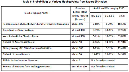 And the entirety of Section V [sic] "A Further Discussion of Catastrophic Impacts and Damage Functions" of the IWG 2010 report describes "tipping points" and "damage functions" that are probabilities assigned to different values of global temperature change. Table 6 from the IWG2010 indicated the probabilities of various tipping points.