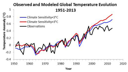 CAPTION: Observed global average temperature evolution, 1951-2013, as compiled by the U.K's Hadley Center (black line), and the average temperature change projected by a collection of climate models used in the IPCC Fifth Assessment Report which have a climate sensitivity greater than 3.0°C (red line) and a collection of models with climate sensitivities less than 3.0°C (blue line).