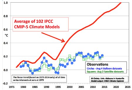 The divergence between observations and climate model projections is even worse in the earth's low-to-mid atmosphere (Figure below). As shown by Christy (2015), there is a gross departure of "reality" from model predictions. Christy (2015) noted that "On average the models warm the global atmosphere at a rate three times that of the real world."
