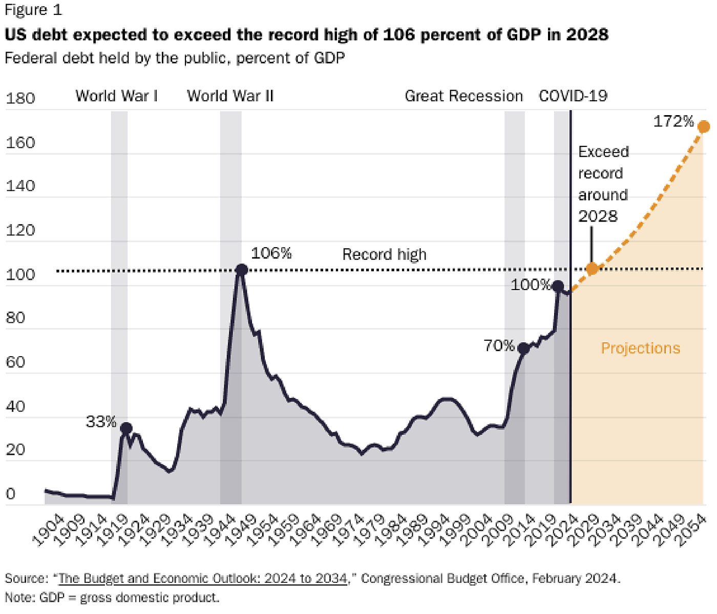 Our nation’s debt is growing at an alarming rate, and this growth is primarily driven by increased government spending. According to the February Congressional Budget Office (CBO) outlook, Social Security and federal health care programs are the largest programmatic causes of spending‐based deficit growth, with publicly held debt projected to reach an unprecedented 172 percent of GDP by 2054 (see figure 1 below).1