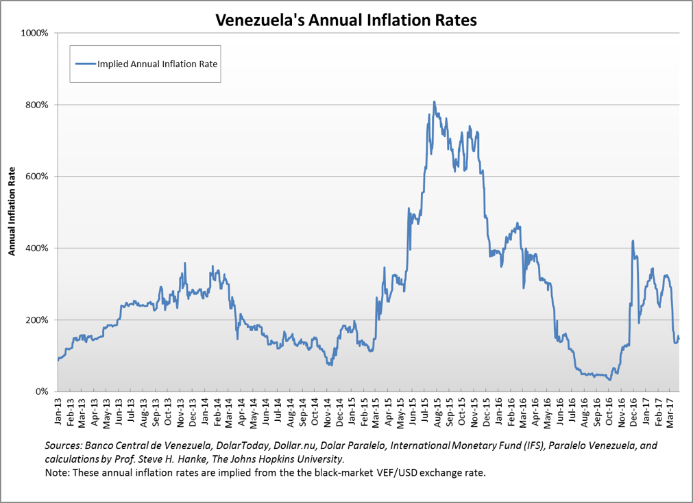 We compute the implied annual inflation rate on a daily basis by using PPP to translate changes in the VEF/USD exchange rate into an annual inflation rate (Hanke and Bushnell, 2016). The chart below shows the course of that annual rate, which peaked at 800% (yr/yr) in the summer of 2015.